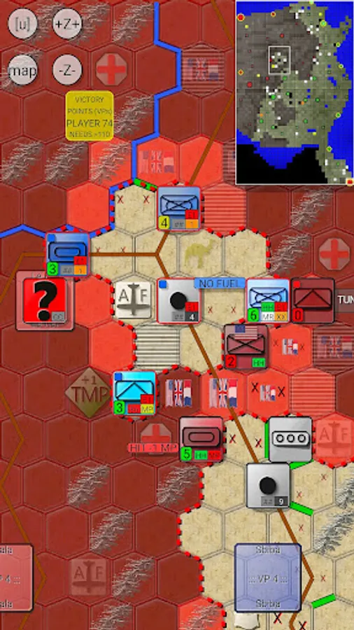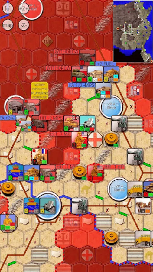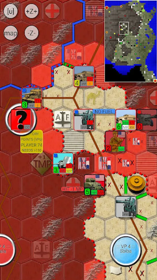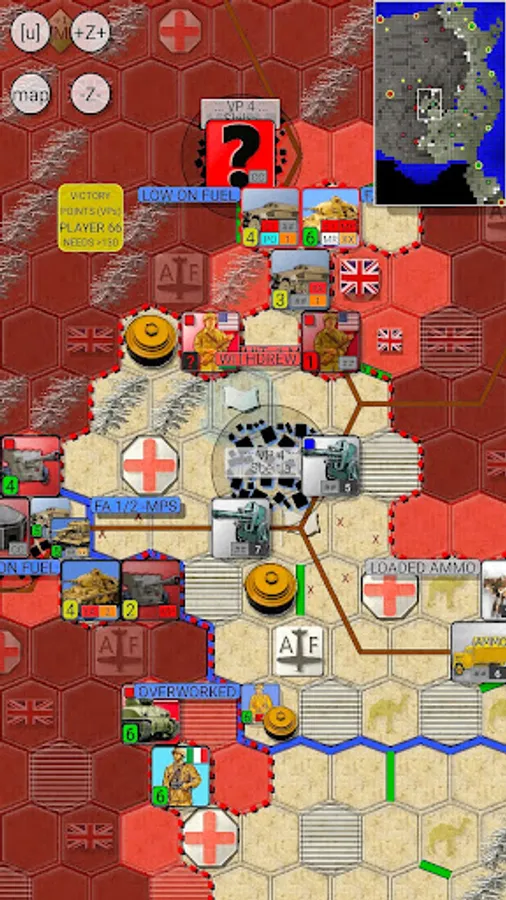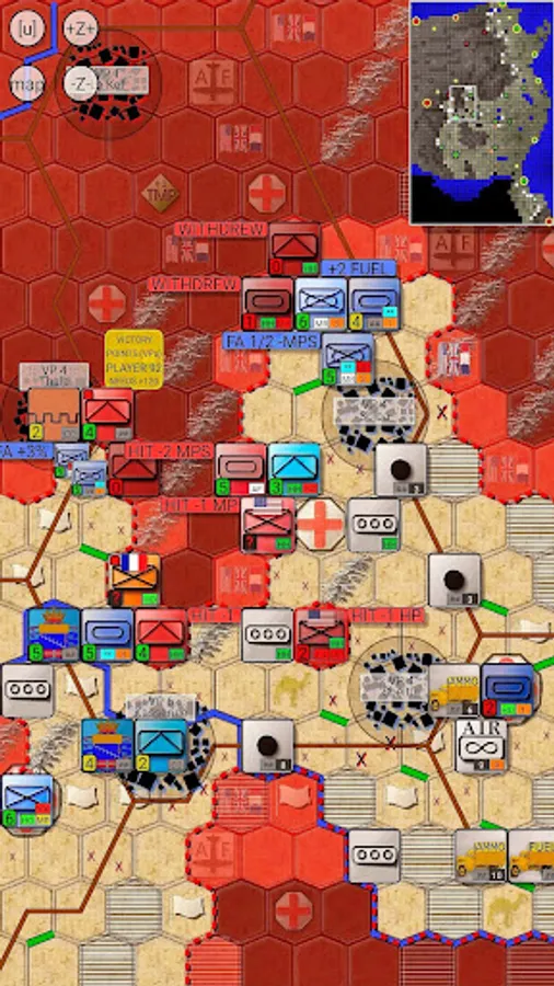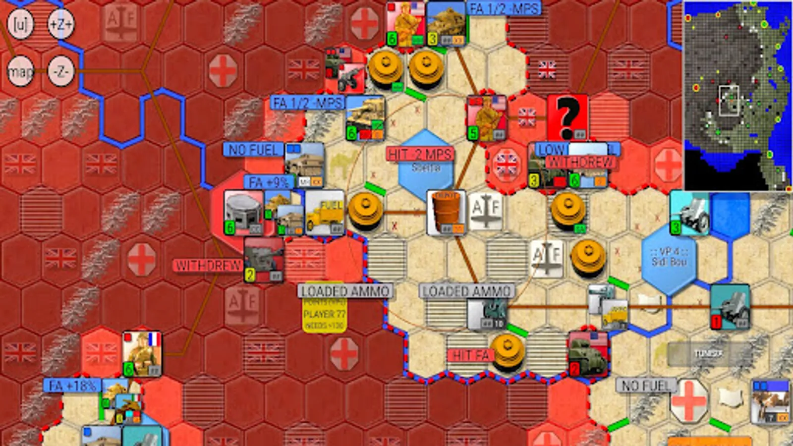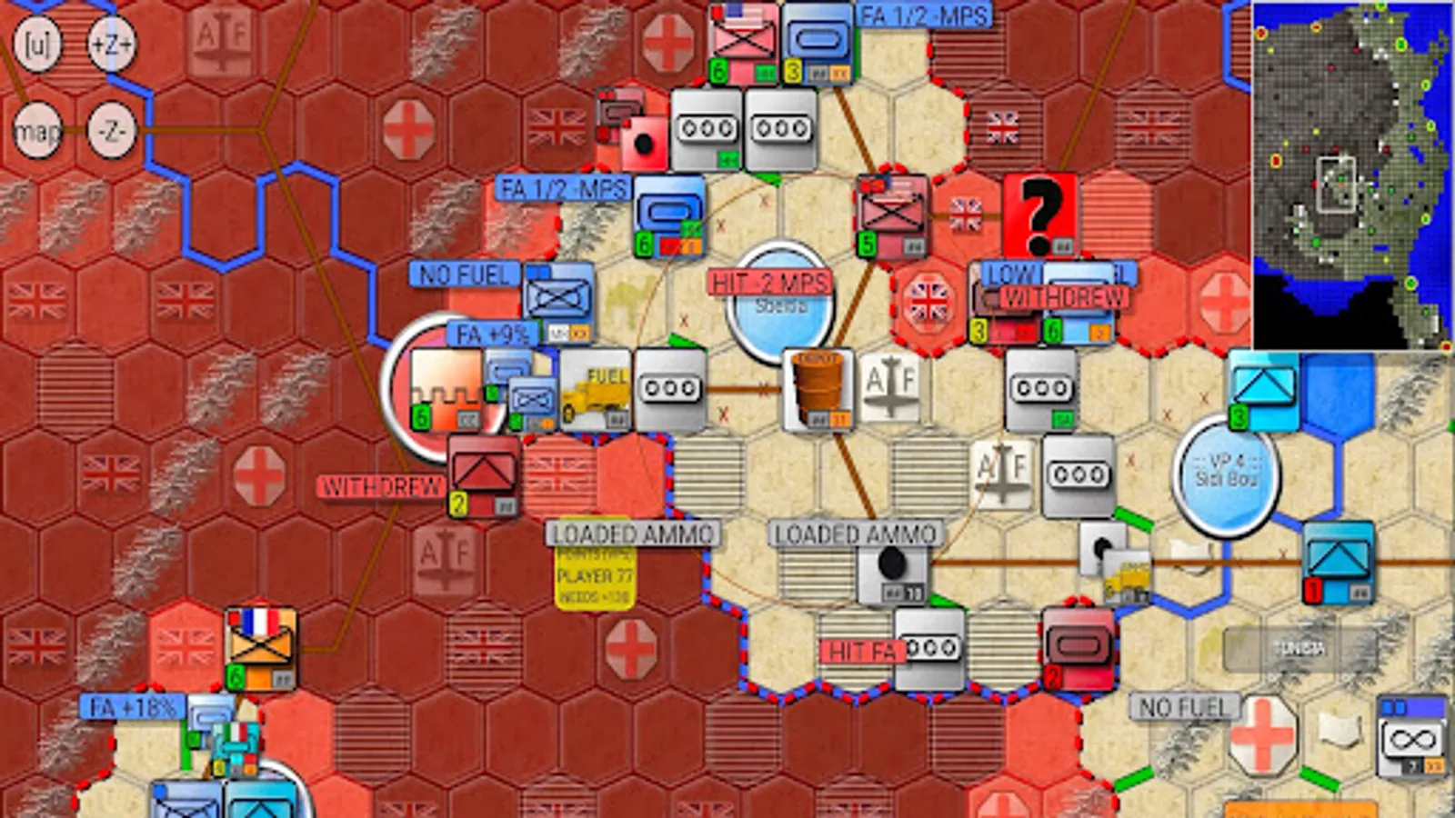 The Allies are rebuilding and regrouping after the failed run to Tunis; the British 8th Army is still far away; and the Allied stranglehold on the Axis supply routes from Europe to Tunisia is only just starting to severely reduce the flow of resources. This is the perfect chance for the Axis units concentrating in Tunis to try to flank and encircle a handful of the most advanced Allied divisions by attacking via the Kasserine Pass to take on the inexperienced Americans, seizing the Allied fuel depots located behind the city of Tebessa, and using that extra fuel to drive Panzer Divisions all the way to the city of Bone (northwest corner). If successfully carried out, this difficult maneuver might, once again, turn the tide of war in North Africa and maybe even prevent the notorious collapse of the Axis armed forces in Tunisia.