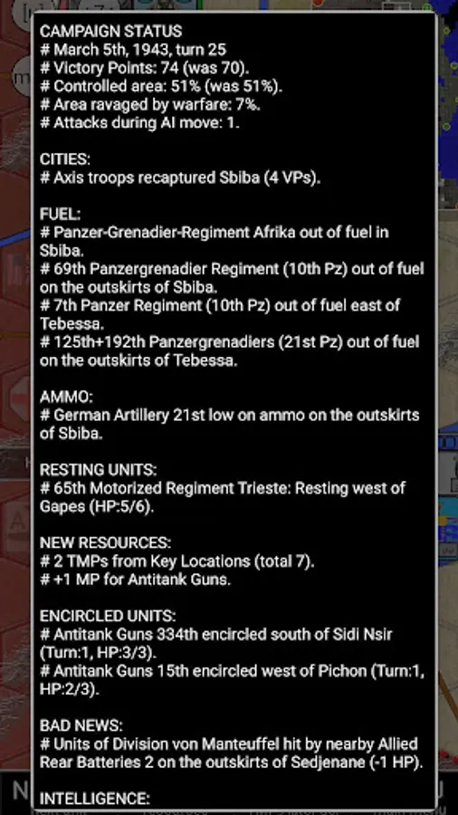 Not only will you face tough decisions about the motorized attack—how many spearheads to use, when to turn north, how to make the meager fuel last to the targets—but also about the wider strategic situation in Tunisia: will you take an offensive or defensive posture vs. the eventually coming attack by the British 8th Army, and how will you handle northern Tunisia, where more and more infantry and some special units will eventually become available as the desperate last reinforcements from Europe arrive before the Allied stranglehold of the Mediterranean supply routes starts to reduce the amount of fuel and resources available?