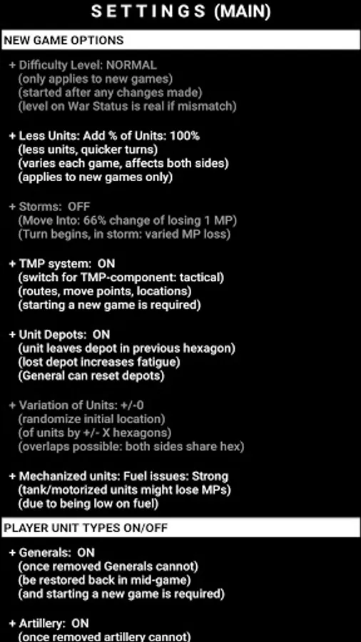 + Settings: A ton of options available to alter the look of the gaming experience: Change difficulty level, hexagon size, Animation speed, choose icon set for units (NATO or REAL) and cities (Round, Shield, Square, block of hourses), decide what is drawn on the map, and much more.