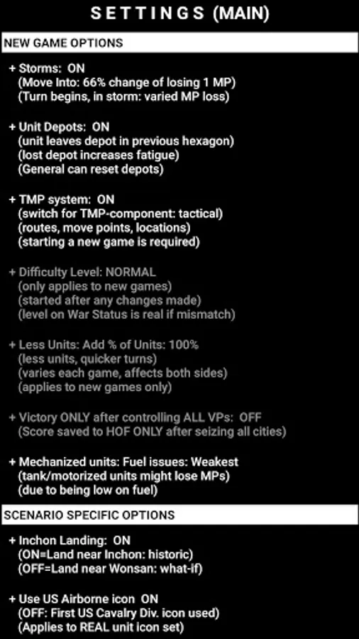 + Settings: Various options are available to alter the look of the gaming experience: Change difficulty level, hexagon size, Animation speed, choose icon set for units (NATO or REAL) and cities (Round, Shield, Square, block of hourses), decide what is drawn on the map, and much more.