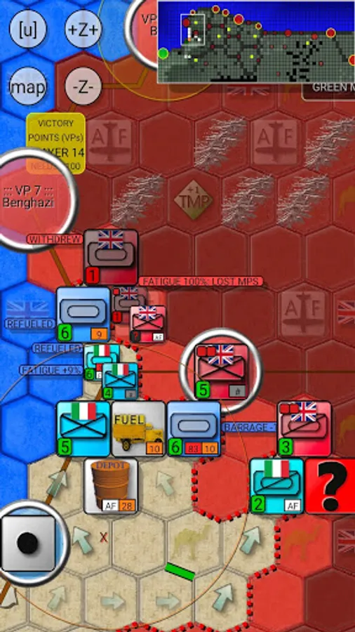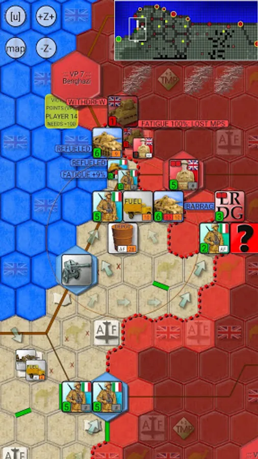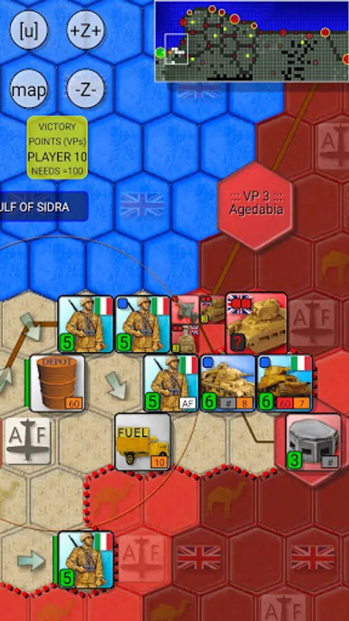 Supply Rules: To keep your armored and motorized divisions on the move you must use Fuel Trucks to transport fuel from Fuel Depots to front line units. Fuel Depots can be refueled only from El Agheila (unlimited amount) or Tobruk (limited amount). Meanwhile only El Agheila and Benghazi provide food supply, so units must have a route to either of these cities after the British forces have moved.