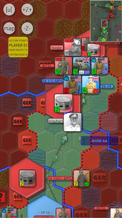 In order to be a victorious, you must learn to coordinate your attacks in two key ways. First, as adjacent units give support to an attacking unit, keep your units in groups in order to gain local superiority. Secondly, it is rarely the best idea to use brute force when it is possible to encircle the enemy and cut off its supply lines with clever maneuvering.