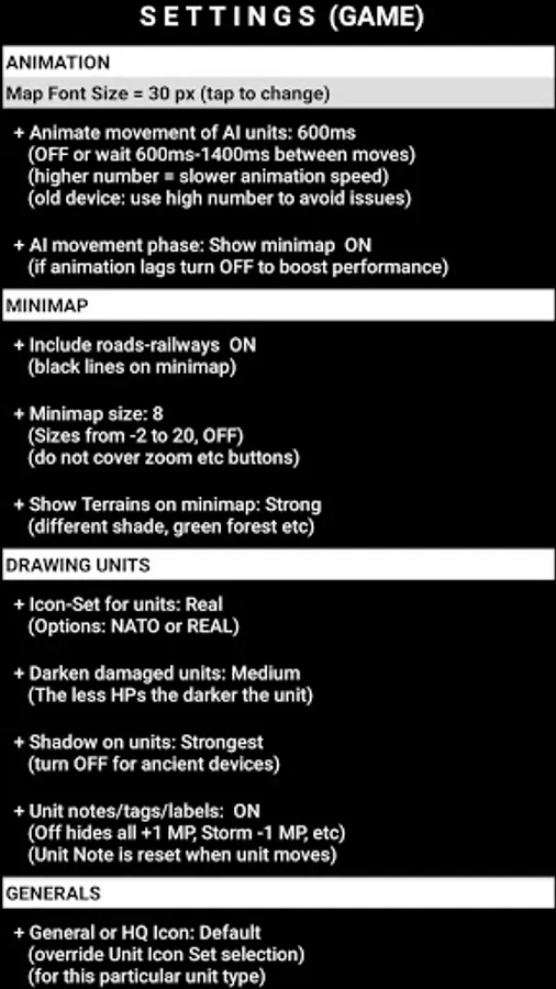 + Settings: Various options are available to alter the look of the gaming experience: Change difficulty level, hexagon size, Animation speed, choose icon set for units (NATO or REAL) and cities (Round, Shield, Square, block of houses), decide what is drawn on the map, and much more.