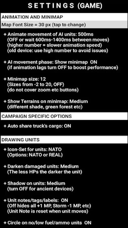 + Settings: Various options (split into two separate views because there are so many of them) are available to alter the look of the gaming experience: Change difficulty level, hexagon size, Animation speed, choose icon set for units (NATO or REAL) and cities (Round, Shield, Square, block of houses), decide what is drawn on the map, turn resource types ON/OFF, and much more.