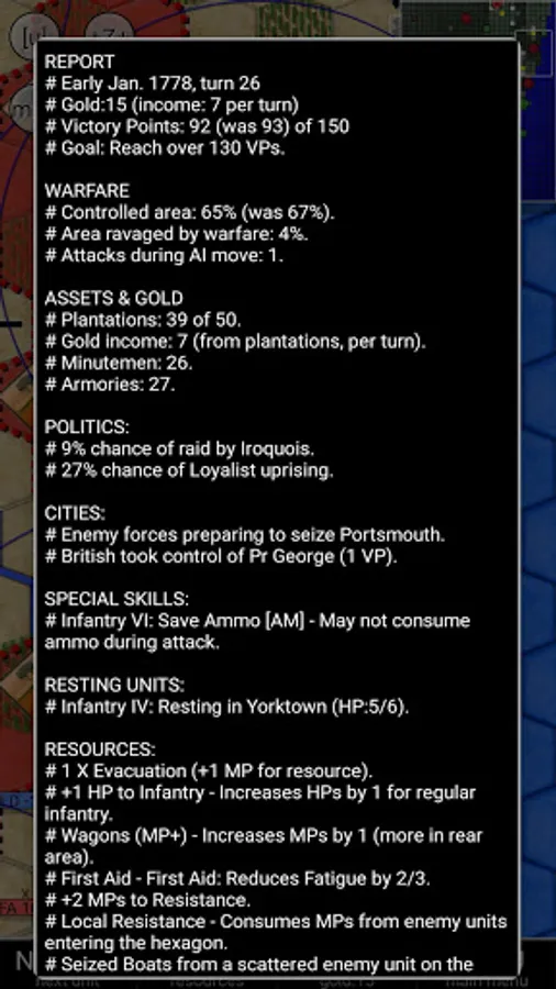 You are in command of the ragtag US armies during the American Revolutionary War (1775–1783). The object of the game is to fight off British forces and control enough cities to be able to claim independence. Events threatening the colonies include raids by Iroquois warriors, uprisings by royalist units, and Hessians and British forces landing on your shores.
