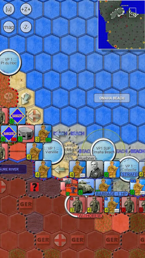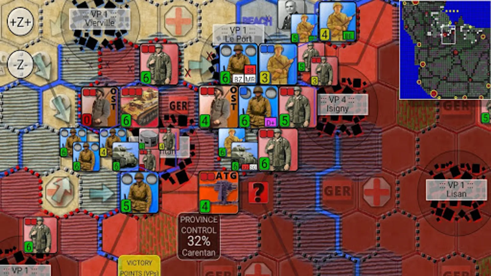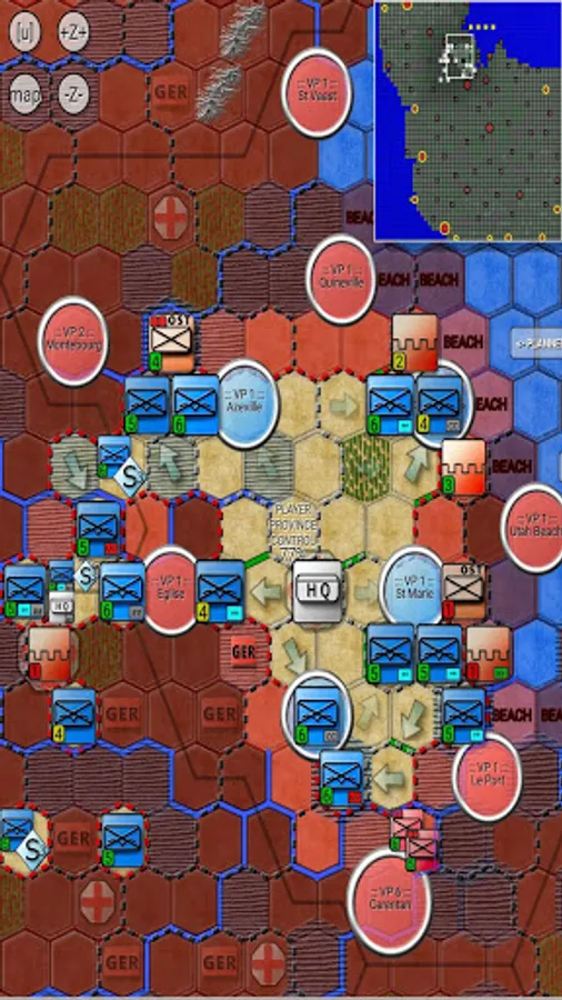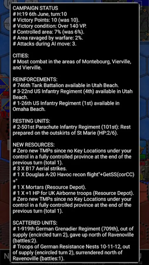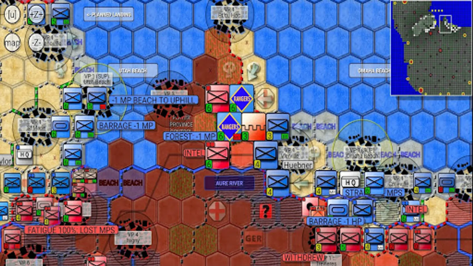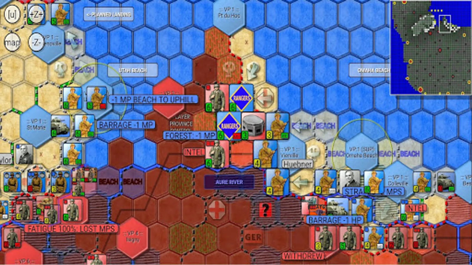 You are in command of the American force carrying out the western part of the 1944 Normandy D-Day landings: Utah and Omaha beaches and the airborne landings of the 101st and 82nd paratrooper divisions. The scenario starts with the 101st Airborne Division dropping during the night in the first wave and the 82nd Airborne Division on the second wave west of Utah Beach to control the key causeway and seize the crossing towards Carentan, and in the big picture, to speed up the drive to Cherbourg to secure a major port as quickly as possible. On the morning of June 6th, American troops start landing on the two selected beaches while US Army Rangers targeting Grandcamp via Pointe du Hoc split up in the chaos, and only some of the units land on Pointe du Hoc while the rest land on the edge of Omaha Beach. After seizing the heavily fortified port city of Cherbourg, the Allied plan is to break out from the Normandy bridgehead using the western coastal road network and ultimately break free via Coutanges-Avranches and free France.