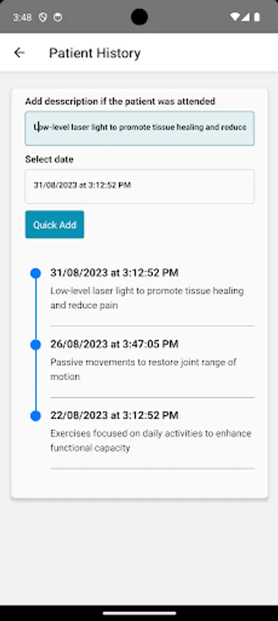 π¨ββοΈπ Whether you're at the clinic or making house calls, HealthConnect ensures you're always in control. Record treatments administered with precision and maintain a comprehensive record of patient care. With just a few clicks, you can effortlessly add, update, or delete patient details, making patient management a breeze.