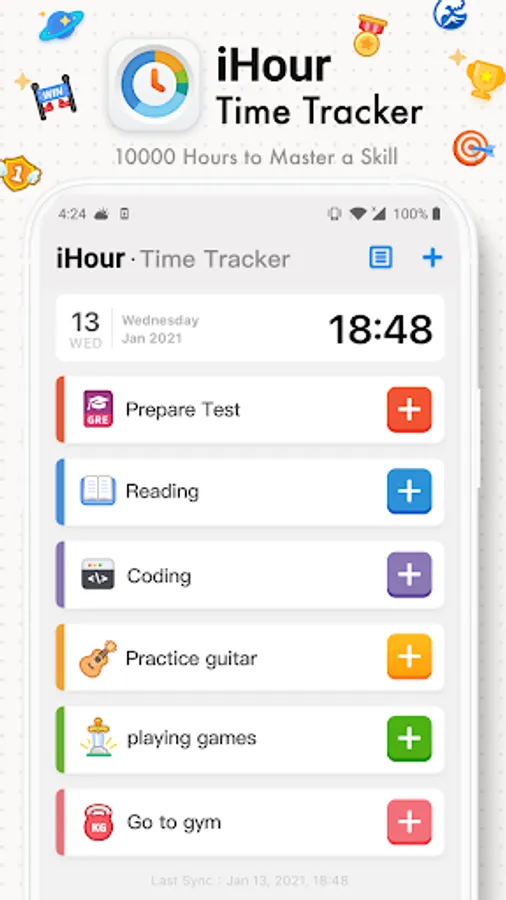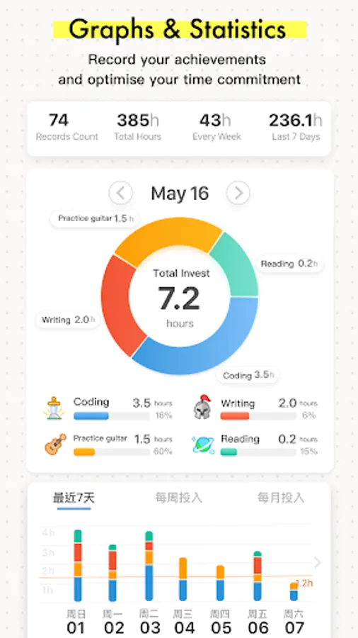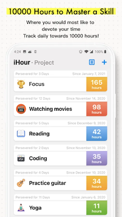 "iHour" helps you plan & track your time spending on habits. You can record things like Play Guitar, Read Book, Coding, Running etc.