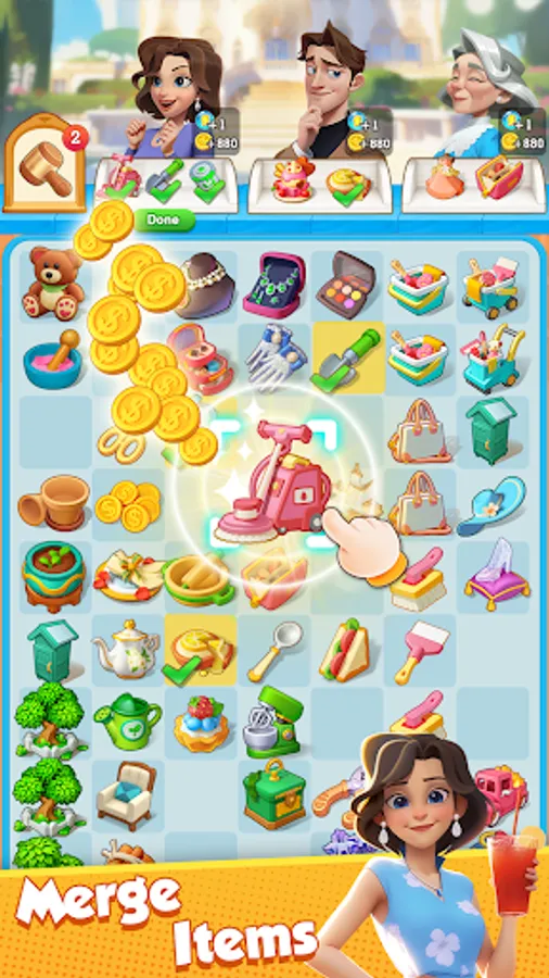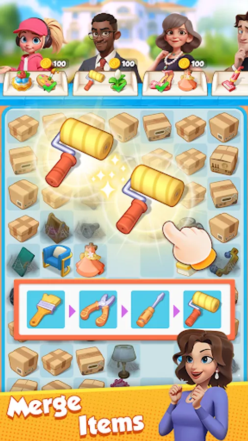 - MERGE tools, flowers, and other items as you solve the matching puzzle!