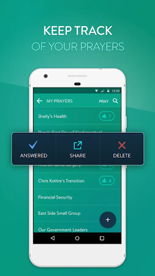 Echo lets you keep a list of every single one of your prayers. You can add as many prayers as you want, categorize them, delete old prayers, and even mark prayers as answered so you can