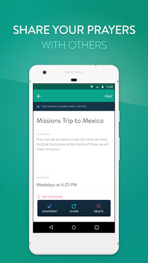 You have the ability to share prayers with other individuals or groups. Share prayers with friends and family privately, or create a group of people and share prayers together. Sharing works great for small groups or focused communities committing to pray for each other throughout the week.