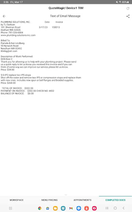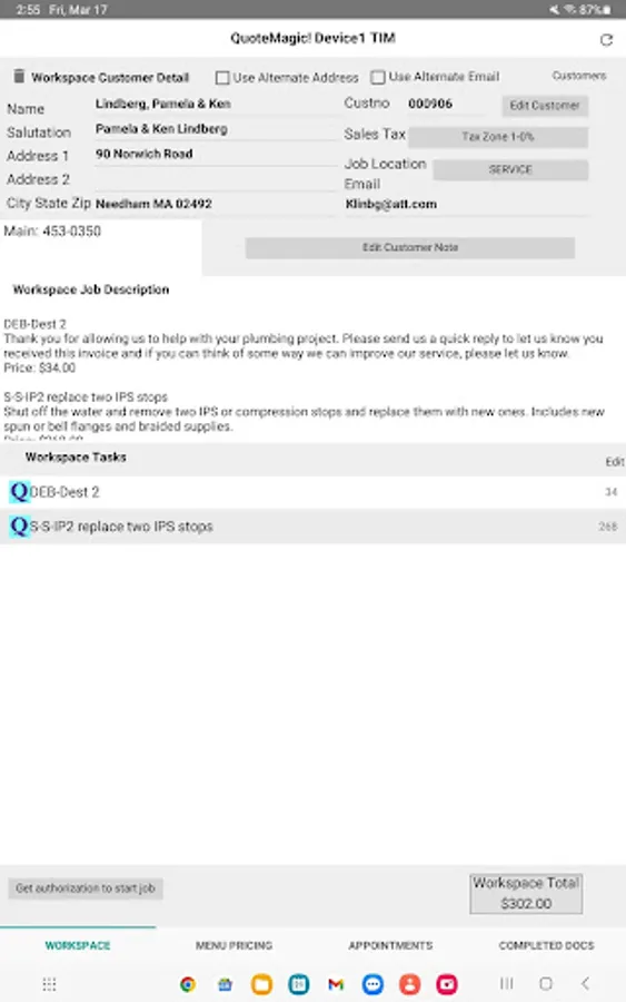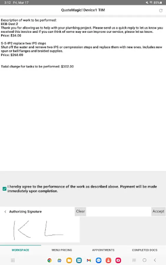 QuoteMagic!, incorporates a ready made menu pricing system created by a flat rate expert. Edit or add tasks to QuoteMagic! using your PricePoint software. Adjust labor rate as needed, reprice tasks using PricePoint's built in database of over 250,000 plumbing/heating items and output to tablets. Close integration with PricePoint scheduling allows a dispatcher to email appointments to technicians in the field. Record payments, make customer changes, capture both the customer's signature authorizing work and upon satisfactory completion. Tablet data is transmitted to the PricePoint desktop software via email so managers will see sales immediately! Export to QuickBooks available through PricePoint software.