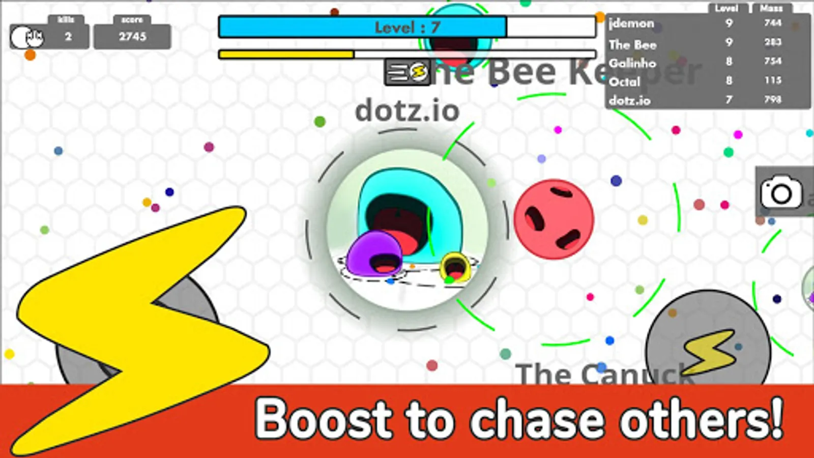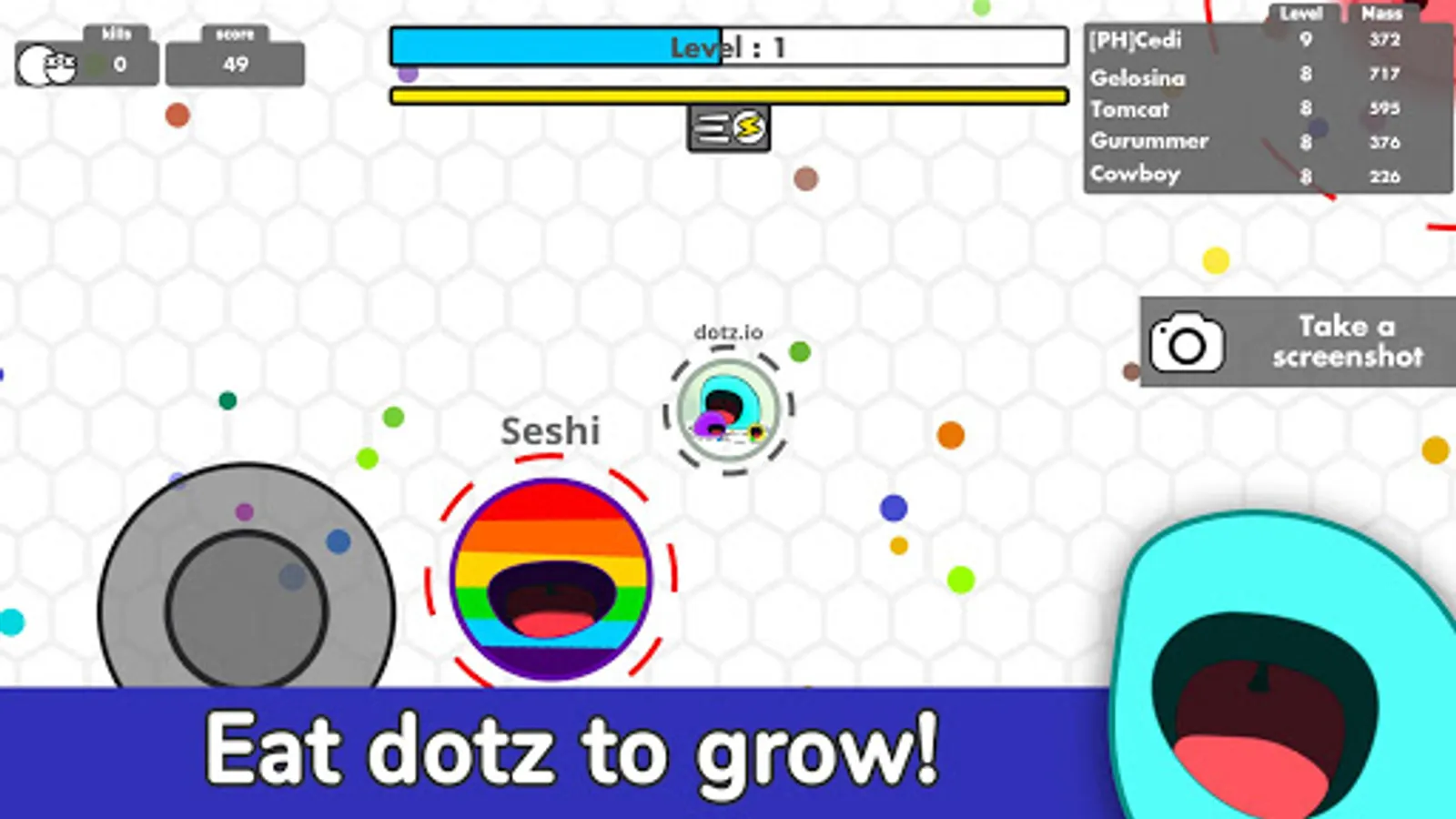In dotz io game, your goal is to become the biggest dot among others! But there is a catch: Each time you level up, your mass shrinks and you have to scale up even more!