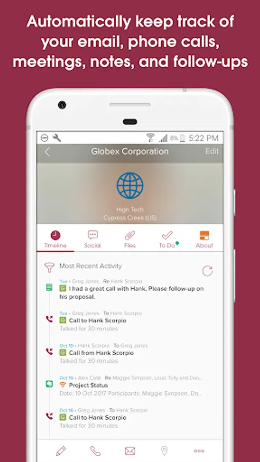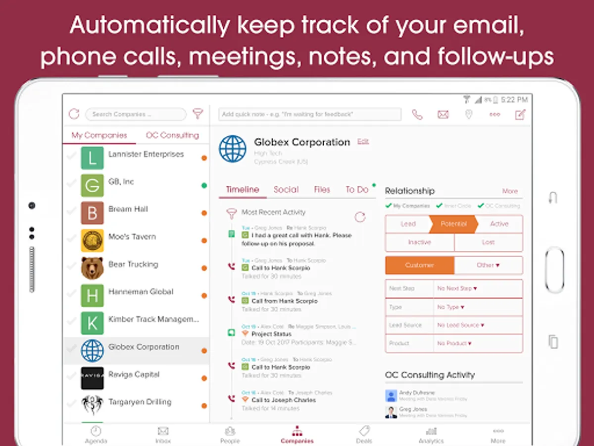 It pulls from your apps to automatically create one view of every person and company - all their contact details, and your complete history - your phone calls, text messages, every email back and forth, meetings, notes, files, social, and messages.