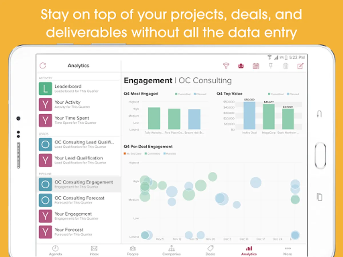• Analytics: Pipeline, forecast, engagement, activity, and lead analytics