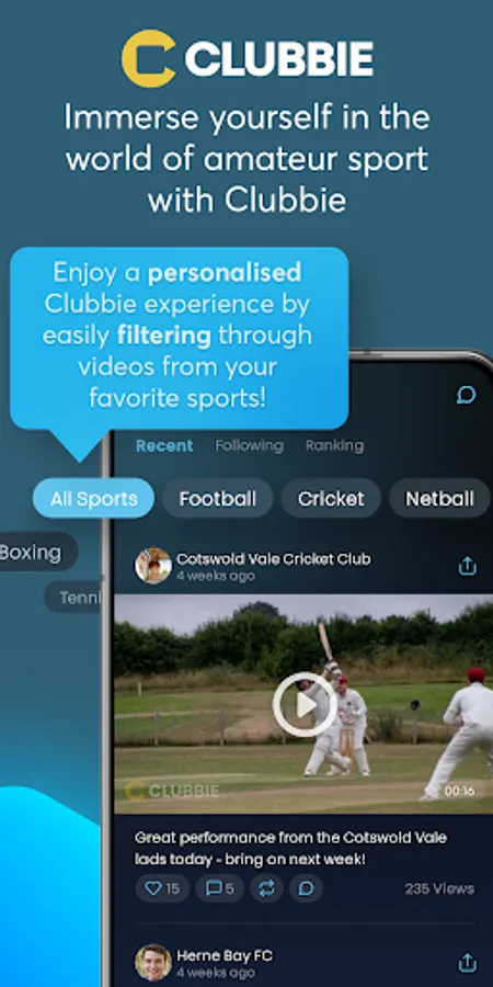 Showcase your sporting highlights to a likeminded community of amateur sport enthusiasts and enjoy a personalised Clubbie experience by seamlessly filtering through videos from your favourite sports. Celebrate, laugh, complete, triumph!