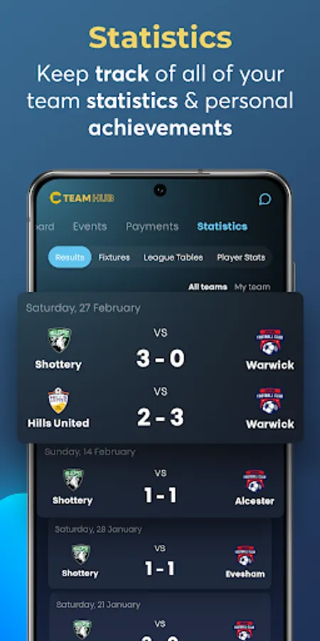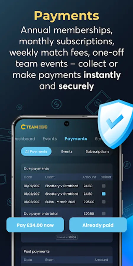 Effortlessly organise team events, create matchday line-ups, process all club payments instantly & securely and keep track of team stats & personal achievements all in one place!