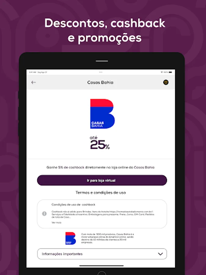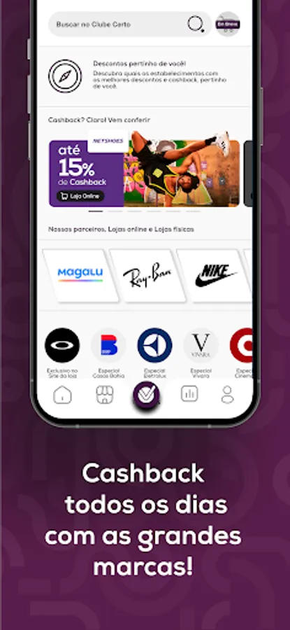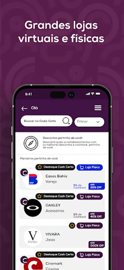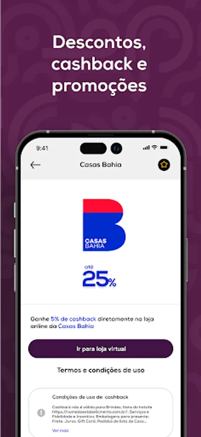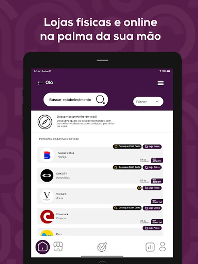 Enjoy exclusive discounts and cashback at more than 30 thousand establishments across Brazil.