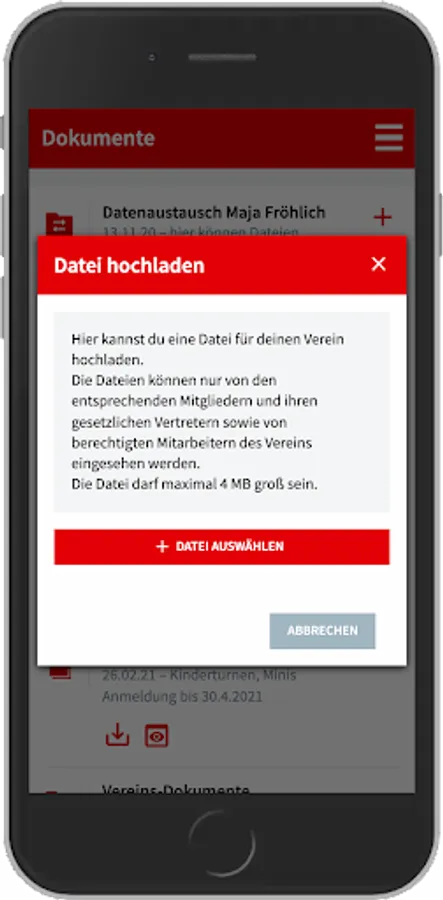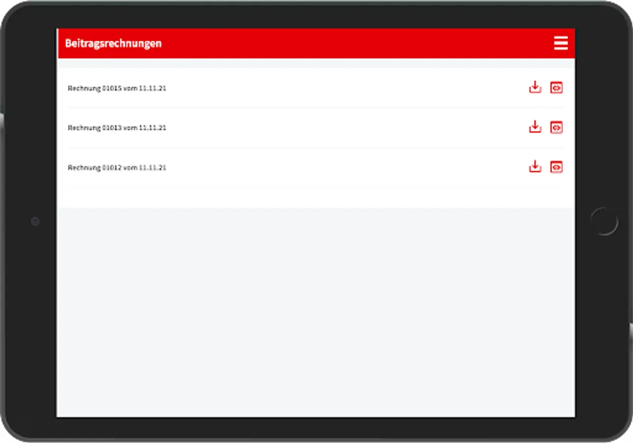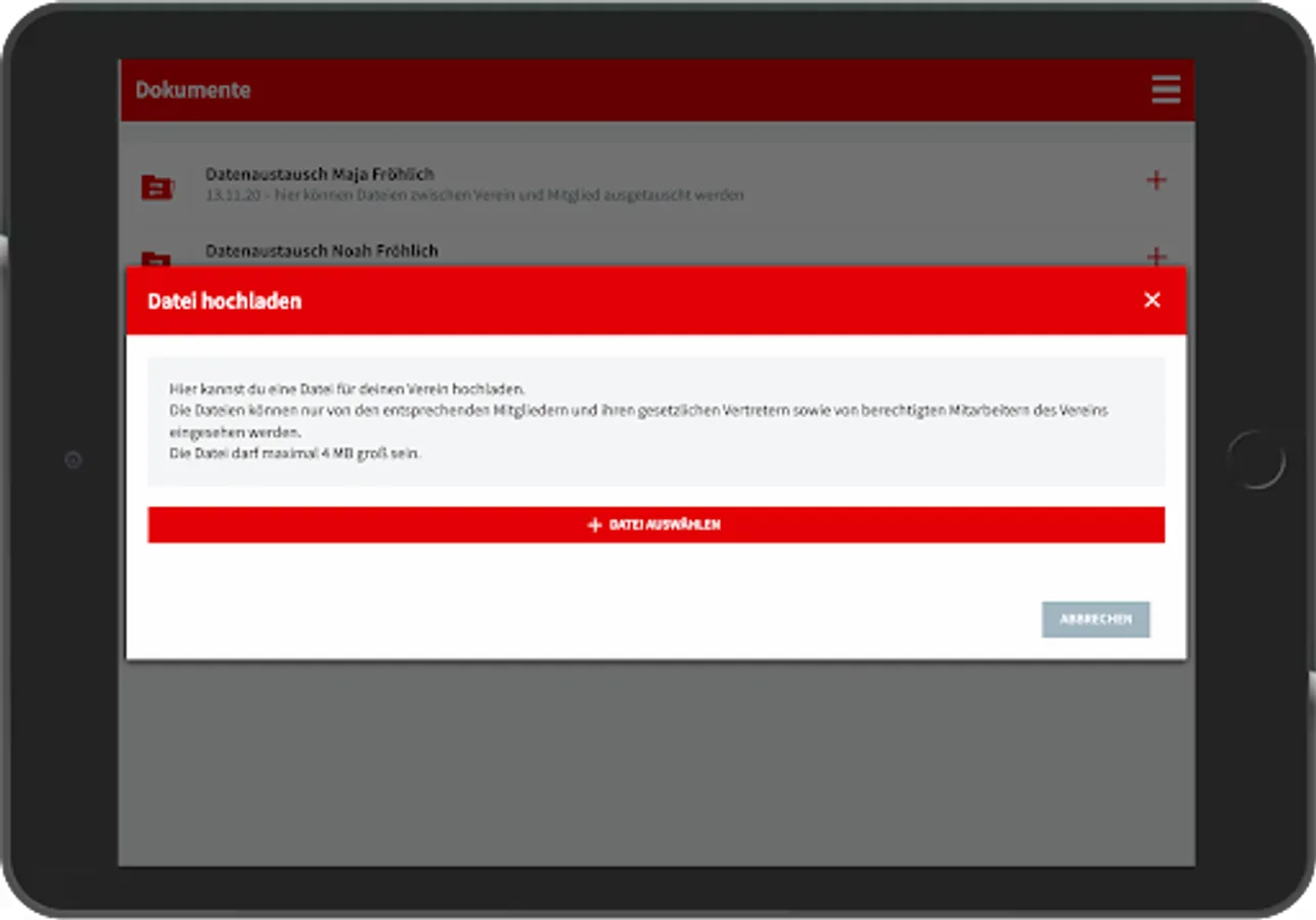 - Upload of documents: Upload important documents, such as notices of discount, certificates or other documents in a data protection-compliant and secure manner, simply via the app to your member administration.