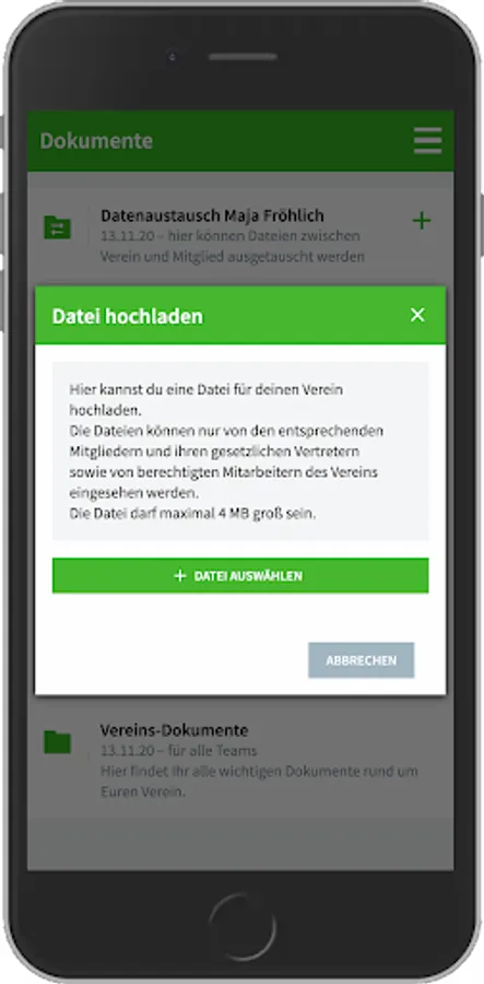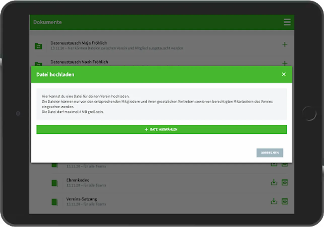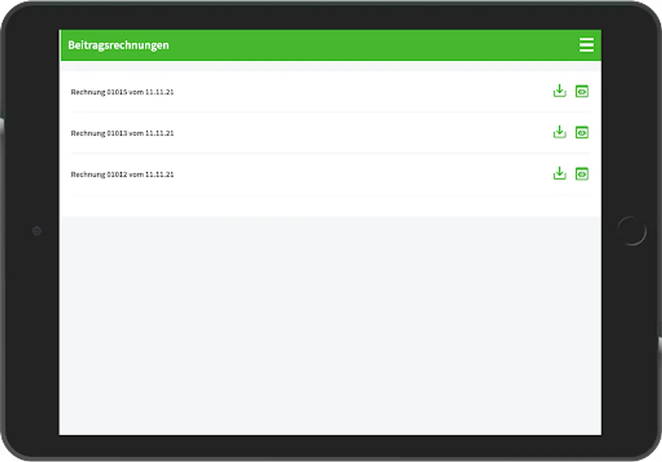 - Upload of documents: Upload important documents such as notices of discount, certificates or other documents in a data protection-compliant and secure manner via the app to your member administration.