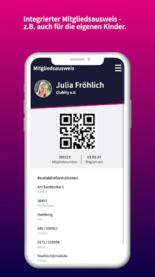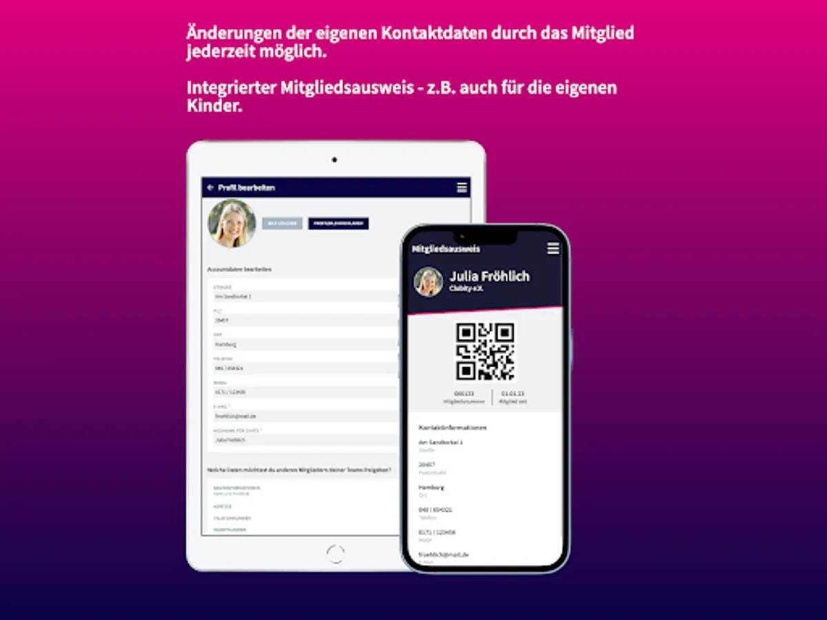 With the latest version of the Clubity member app, you always have all relevant club information and contacts at hand in one place. Change your contact details with just a few clicks, manage your children's data if you wish, or use the integrated membership card for convenient check-in at your club's sports facilities.
