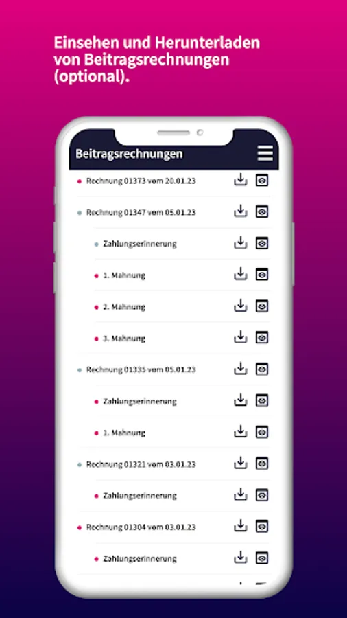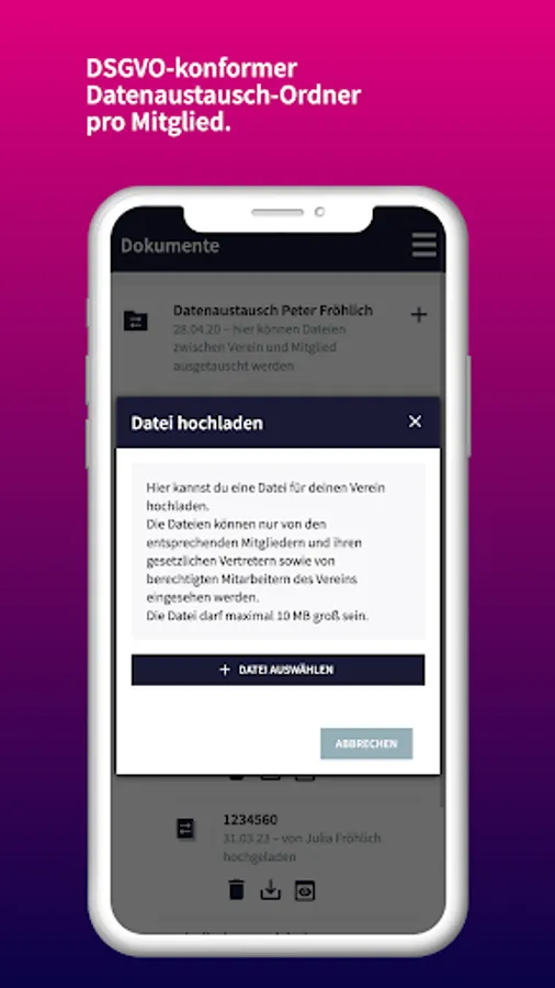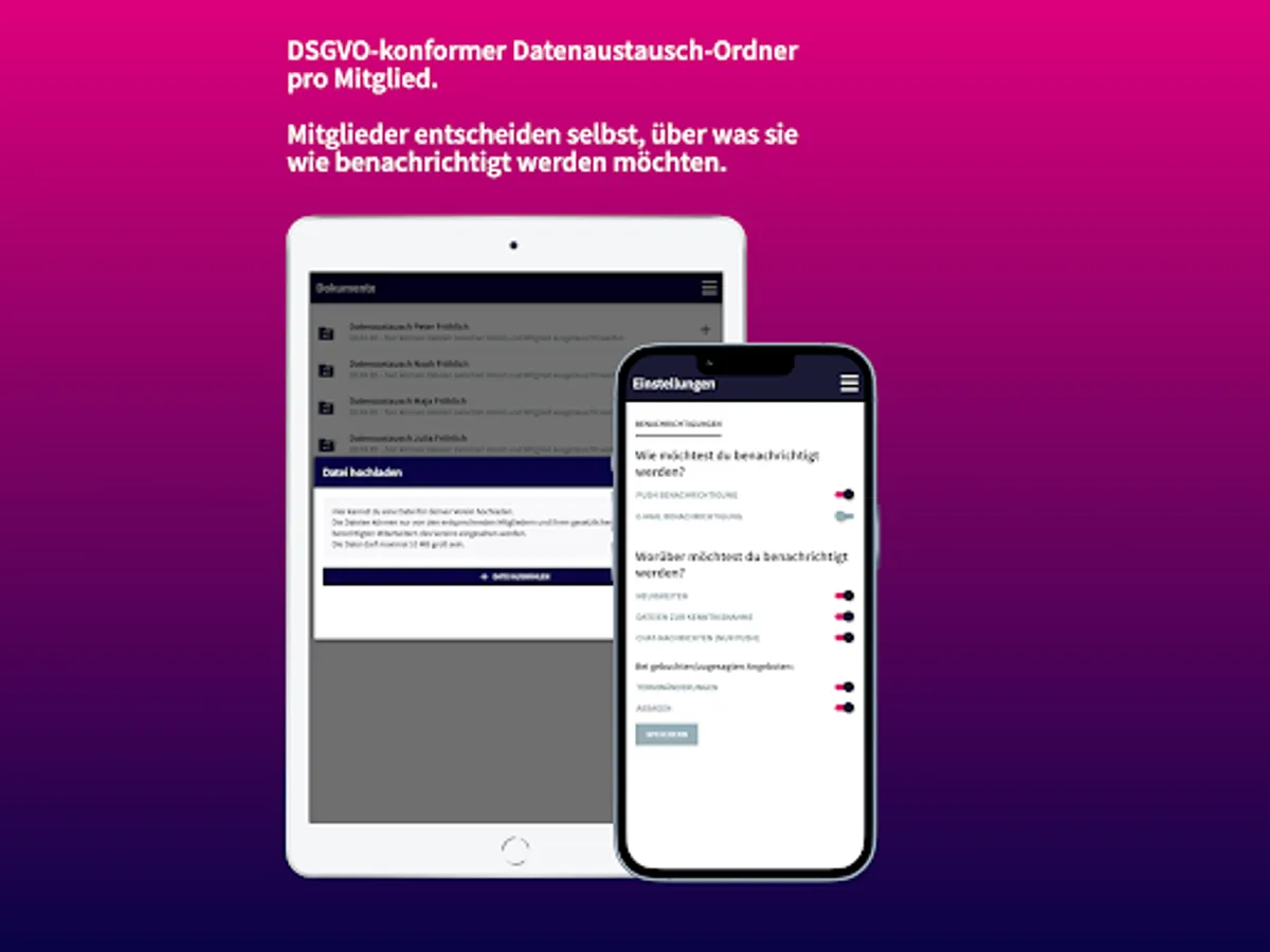 - Upload of documents: Photograph important documents, such as reduction notices or certificates and send them easily and in compliance with data protection via the app to your member administration.