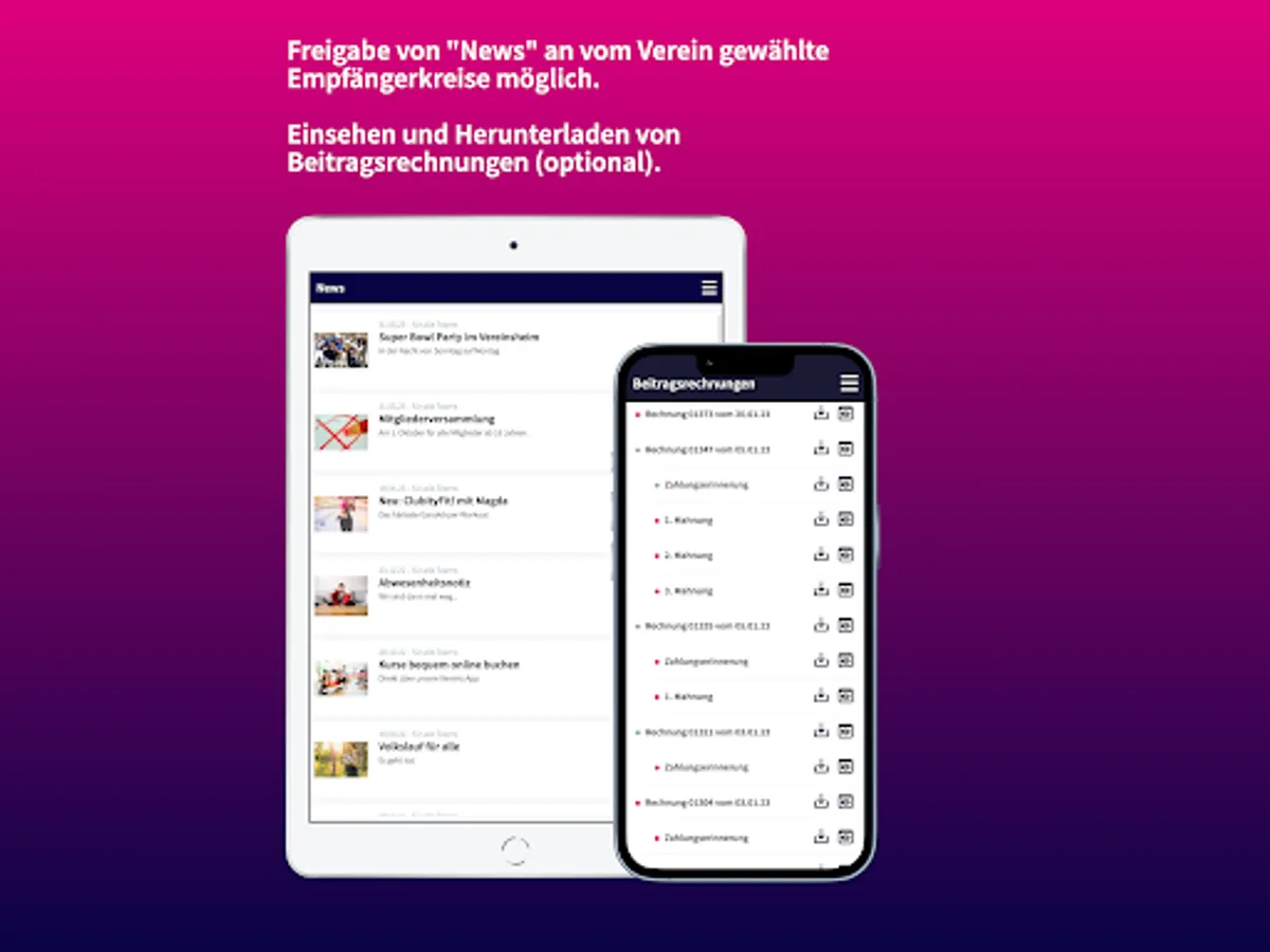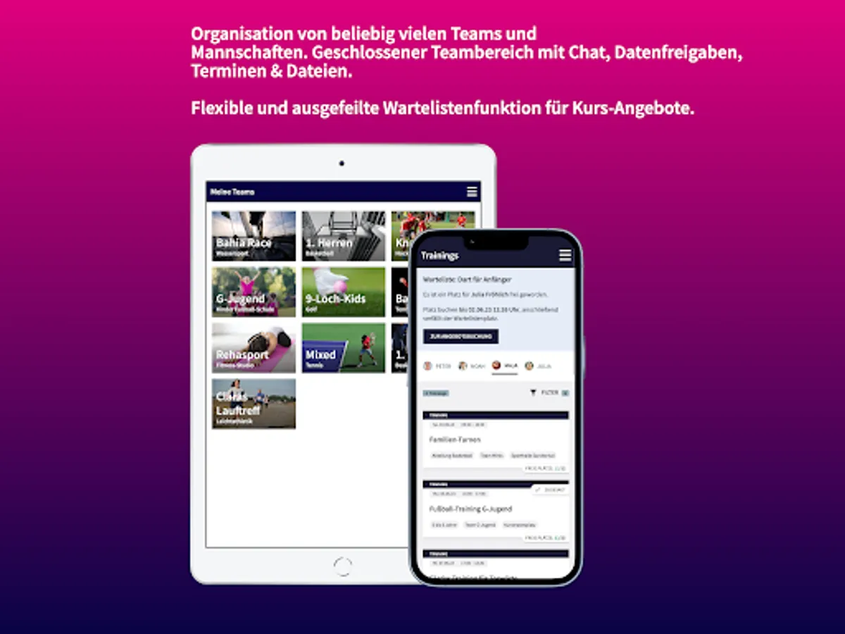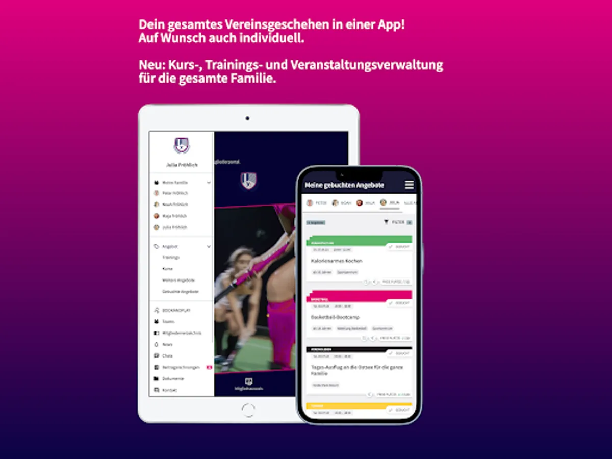 - All training sessions, courses and tournaments at a glance: With the new course and booking overview, you can access everything your club has to offer that is relevant to you or your children, book individual places or courses, accept or decline participation in training sessions and go live informed about any postponements of dates or venues.