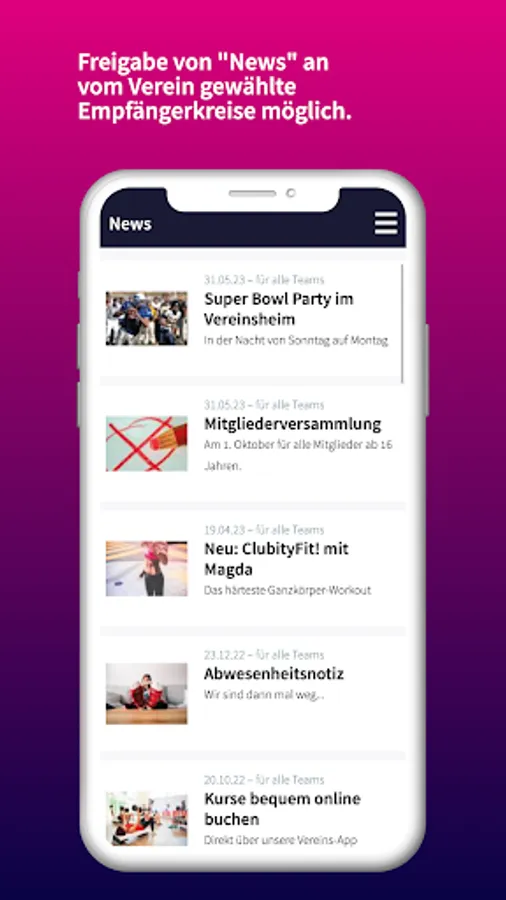 - Notification options: You decide which content you would like to be notified of by your club and how (by push message or e-mail).