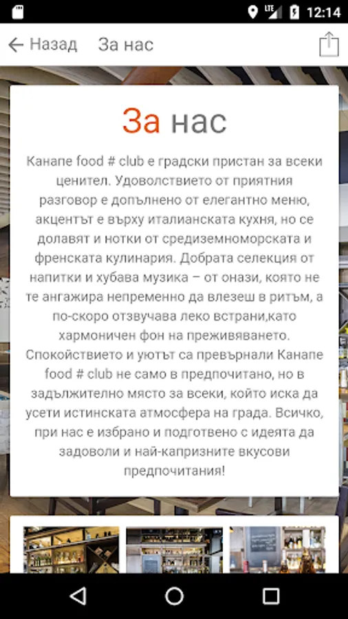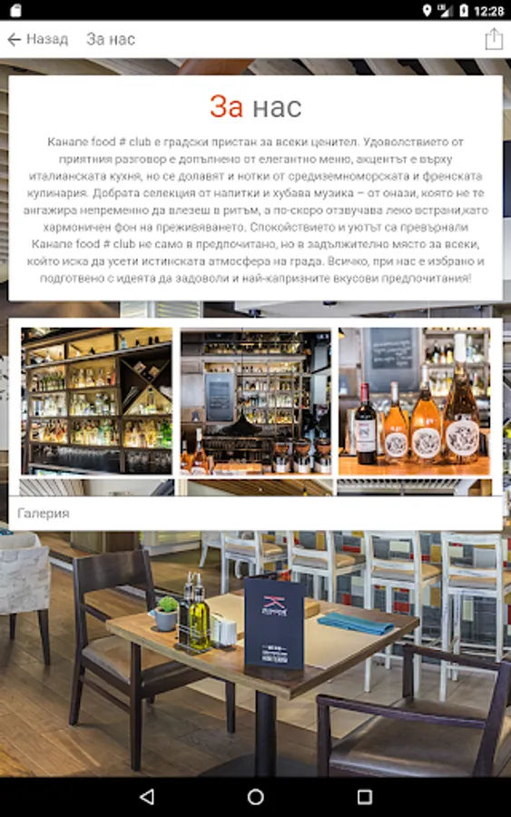 Canape food # club is an urban haven for every connoisseur. The pleasure of pleasant conversation is complemented by elegant menu, the focus is on Italian cuisine, but there are notes of Mediterranean and French cuisine. Good selection of drinks and good music - from one that does not necessarily committed to enter into a rhythm, but rather subsides slightly sideways as harmonious background of experience. The tranquility and coziness have turned Canape food # club not only preferred, but a must for anyone who wants to feel the real atmosphere of the city. Everything with us is selected and prepared with the idea to satisfy the most discerning tastes!