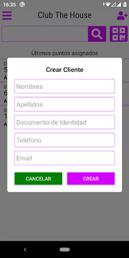 - Buscar clientes por nombre, documeto de identidad, teléfono o código de cliente ( QR )