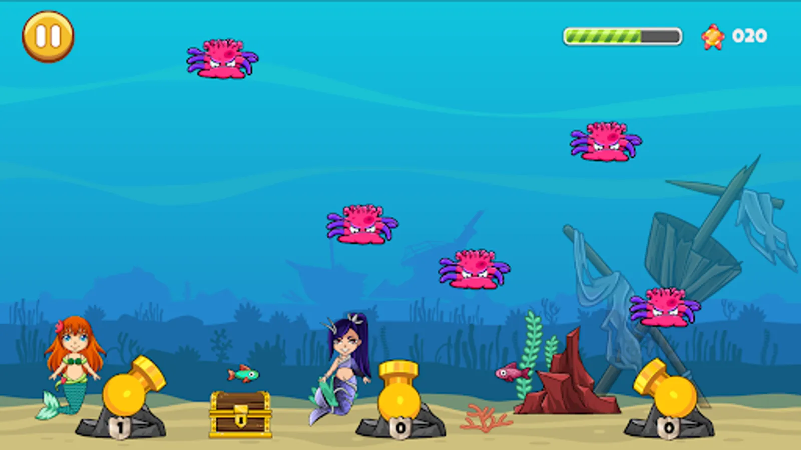 This precision based shooter has players taking control of an army of magnificent mermaids. Get into position and fire your bubble cannon at an array of enemy fish, sharks and a few other surprises. Collect coins to reload. Dodge mines and torpedos and whatever you do, don't touch anything that glows in the dark!