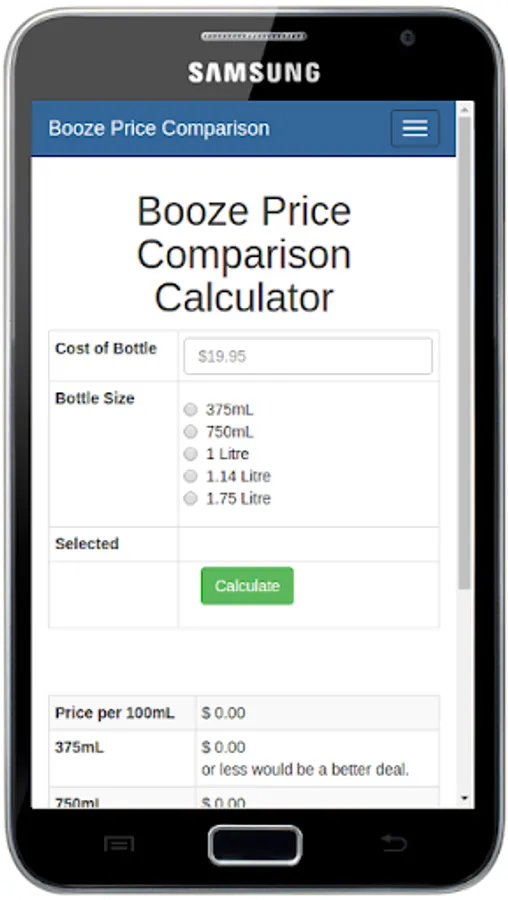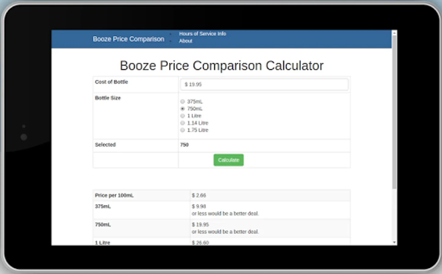 This App will assists you when purchasing various sizes of bottles of booze or alcohol.
