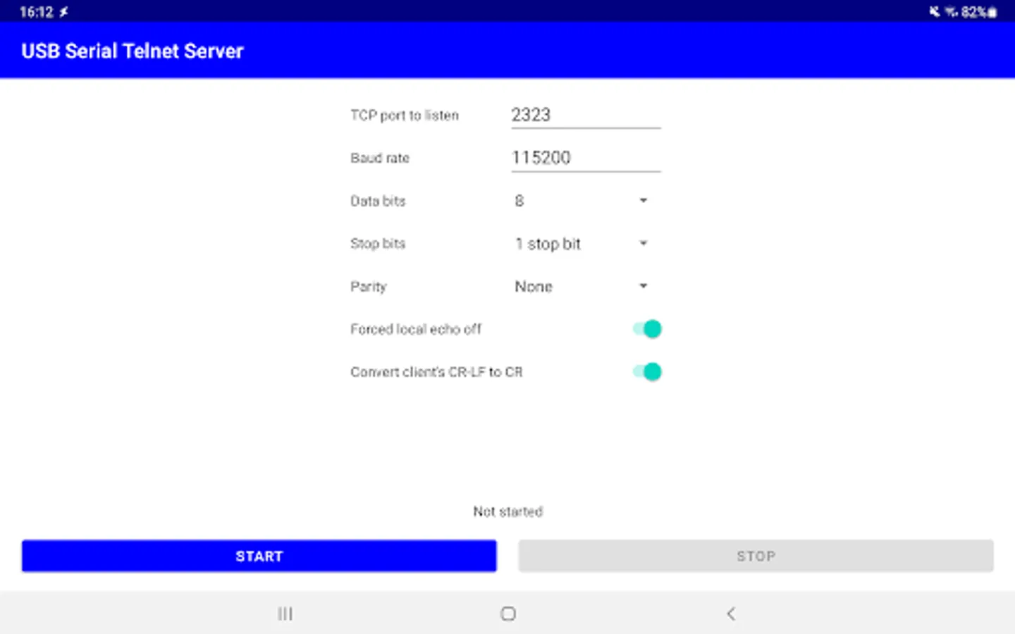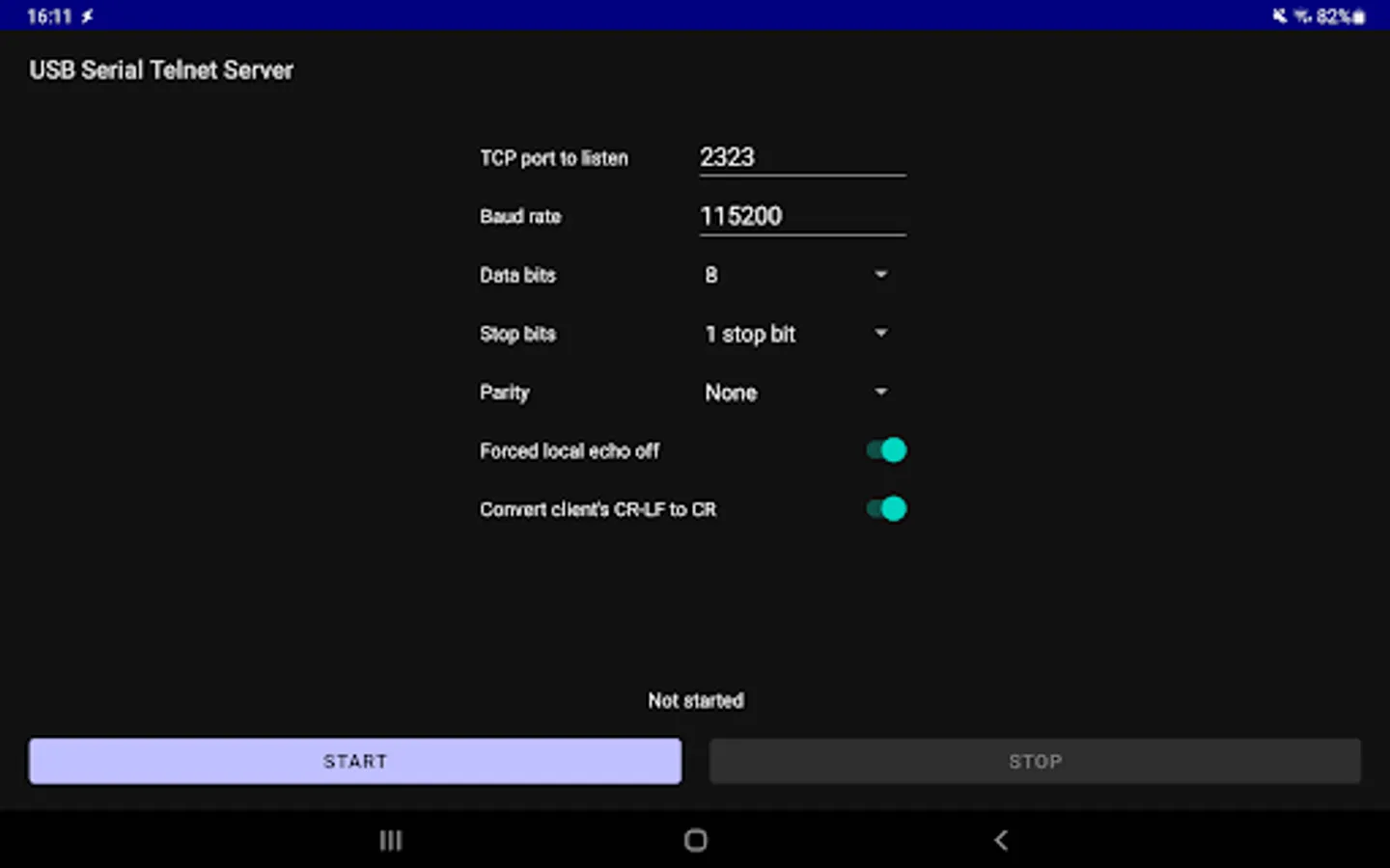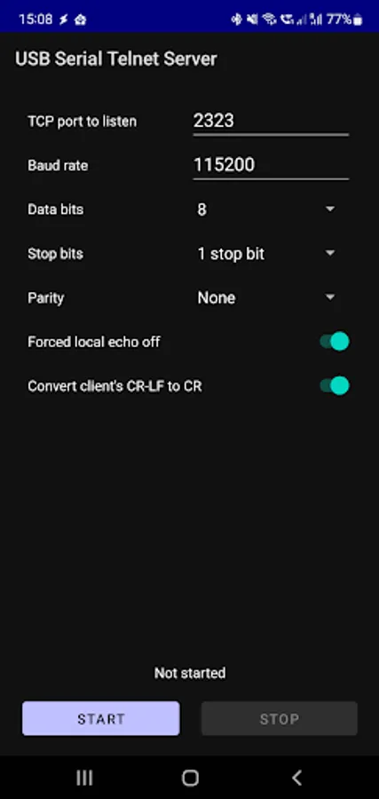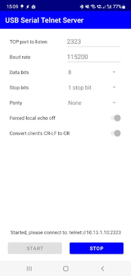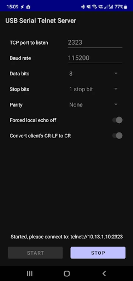 Just connect a USB serial adapter into USB OTG port of your Android device, start this app and connect to it using any Telnet client like:
