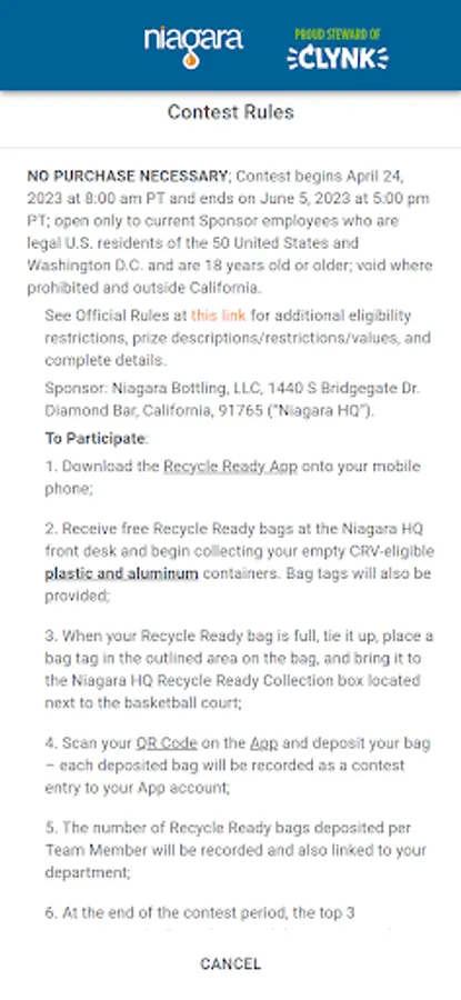 Recycle Ready is a CRV specific container collection and donation app exclusive to Niagara Bottling Team Members. Download the app to register for the Recycle Ready Collection Program at Niagara Bottling's headquarters and join the recycling competition with your fellow Niagara Team Members.