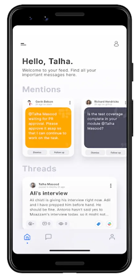 Mention anyone on Slack and Worky pulls that data directly giving you a feed of all the important stuff you need to respond to.
