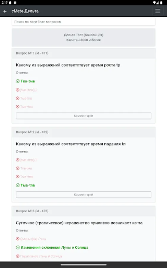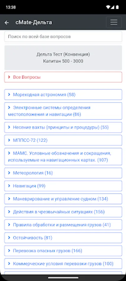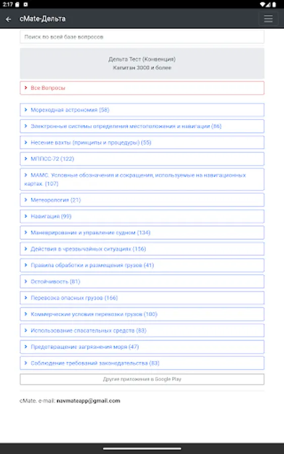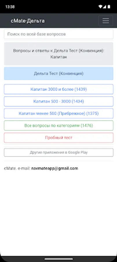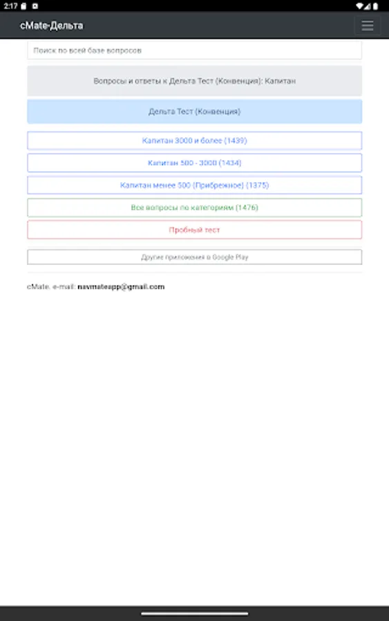 The application contains a database of questions and answers to the latest version of the SKI Convention Plus (Delta test). All questions are divided into Categories: