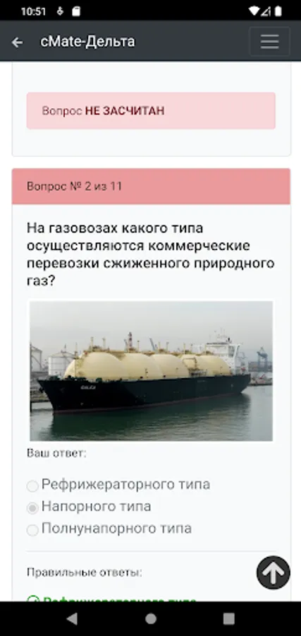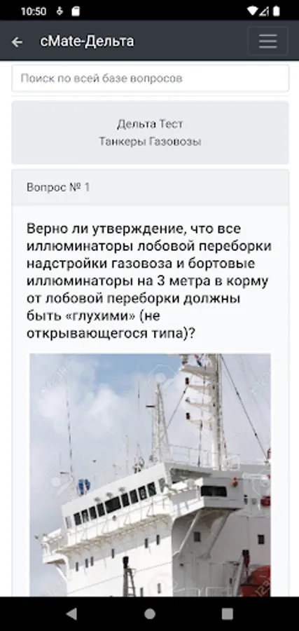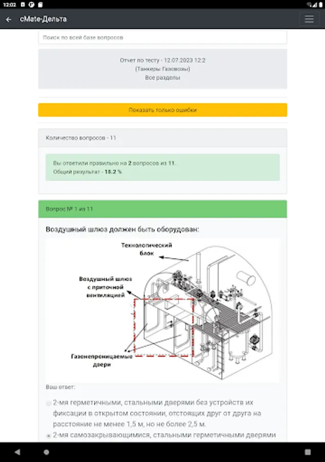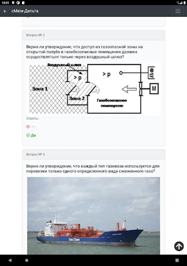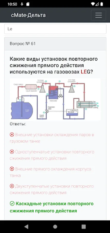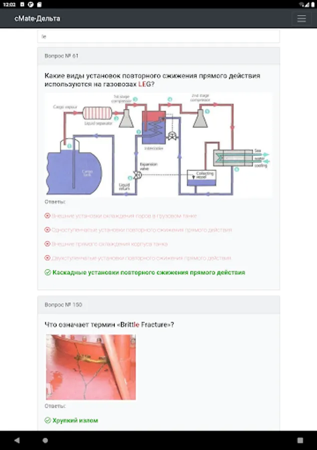 The application is designed to test the knowledge of crew members of ships. Specialists in carrying out cargo operations on gas carriers with initial training
