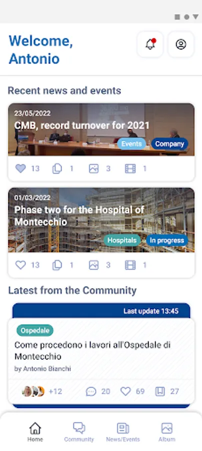 CMB Cooperativa Muratori e Braccianti di Carpi is a construction company specialized in hospital and civil work. With over a Century of experience, CMB builds its future on people and their professional skills, capable of enhancing projects both in the construction sector and in infrastructure and facility management. The new CMB app will allow all employees and company members to receive updated news and communicate easily with each other.