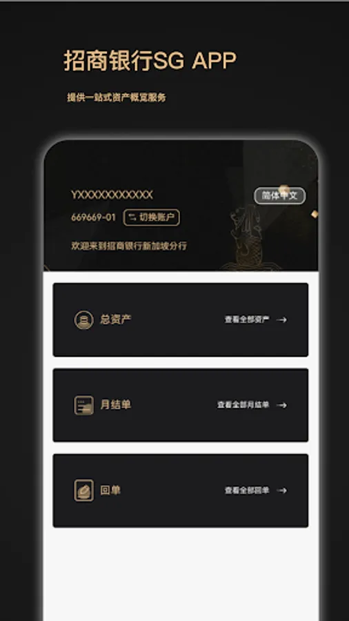 China Merchants Bank SG APP is a one-stop asset overview service provided by China Merchants Bank Singapore Branch for valued private banking customers. The APP mainly provides functions such as asset query, monthly statement query and receipt query.