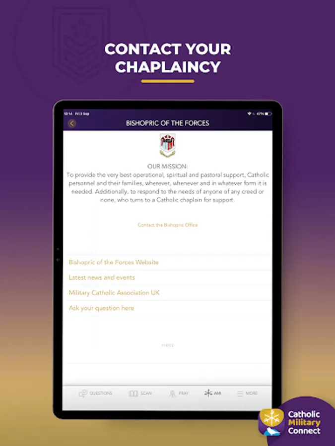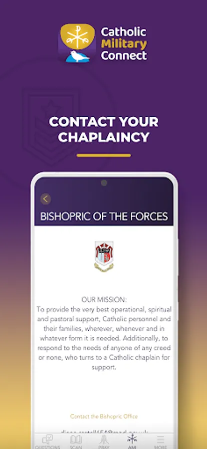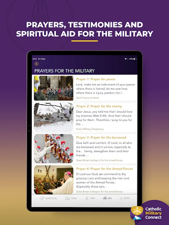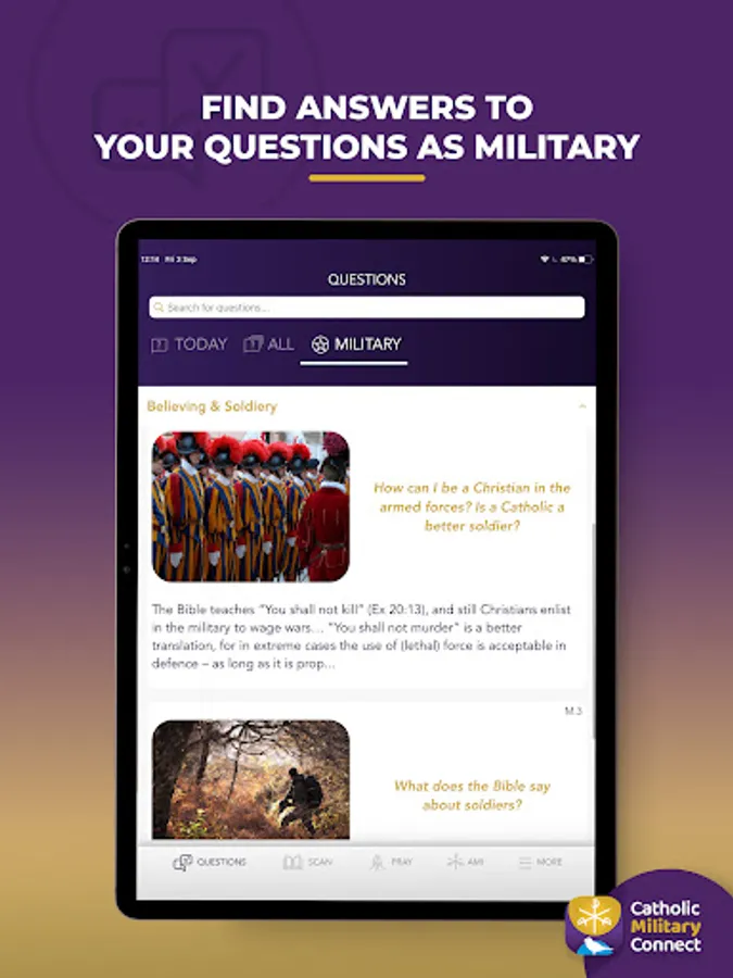 This app is an initiative of the Apostolat Militaire International (AMI) executed in close collaboration with Tweeting with GOD (#TwGOD) to help individual soldiers, sailors, and airmen to find answers to their questions and grow in their faith.