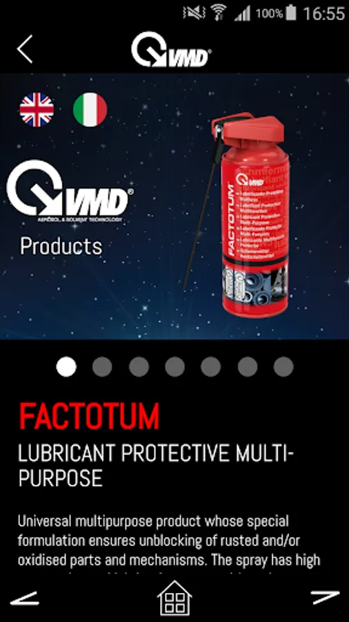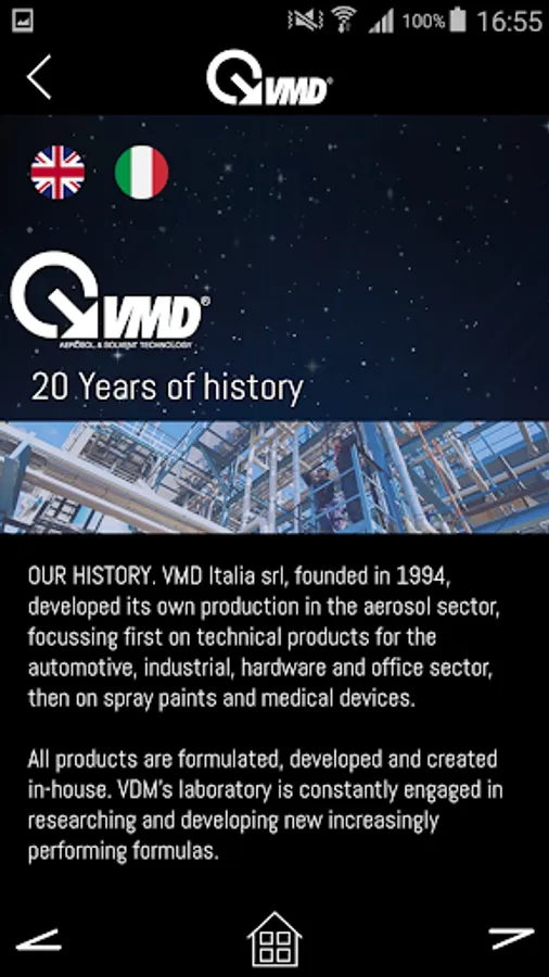 VMD Italia srl, founded in 1994, developed its own production in the aerosol sector, focussing first on technical products for the automotive, industrial, hardware and office sector, then on spray paints and medical devices.