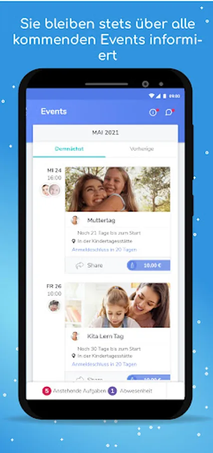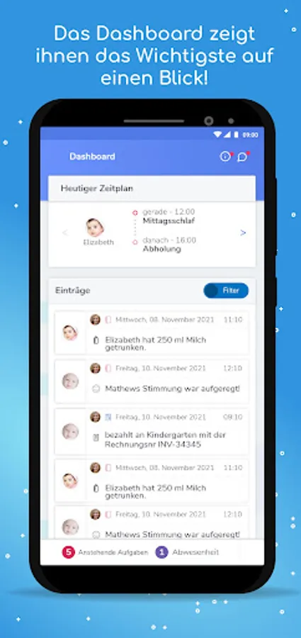 The Kidling daycare app for parents strengthens the participation between daycare, educators and parents. Parents can keep a complete overview of their child's day-to-day activities. You will gain valuable insights into the stages of development of your child.