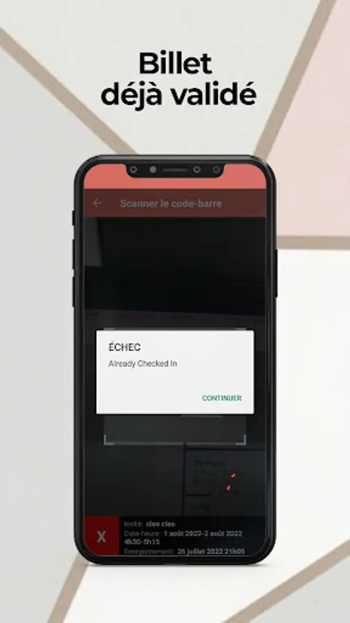 Scan the 1D barcode or QR code on the guest ticket directly from your device using the built-in camera or a portable Bluetooth barcode scanner.