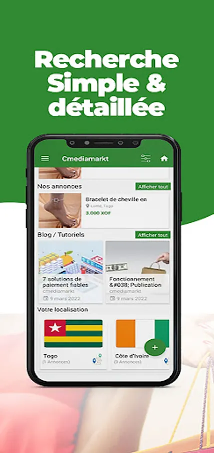 Cmediamarkt is the most popular online marketplace for free classified ads in Togo and Ivory Coast with new and used items of all kinds. Whether you are buying household appliances or selling your old bed, whether you are looking for a cleaner or a new job - at Cmediamarkt you will find what you are looking for.