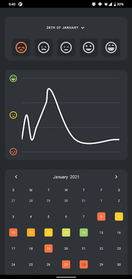 Monthly Tracking. All your historical moods are visible on a monthly basis within the app. You can select a single month at a time to view daily moods and trends.