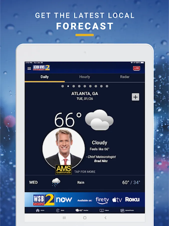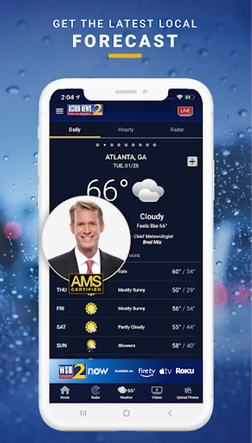• Tracking storms minute-by-minute with StormTracker 2 HD radar and 24/7 access to the 5-day forecast so you know how the weather will impact your day.