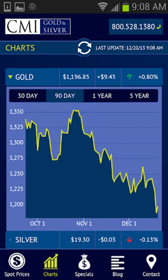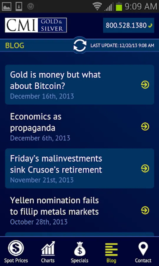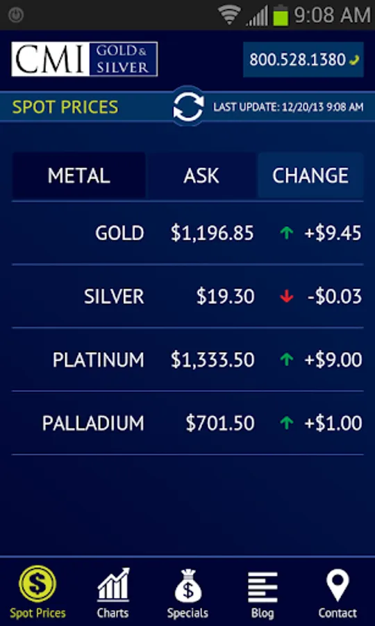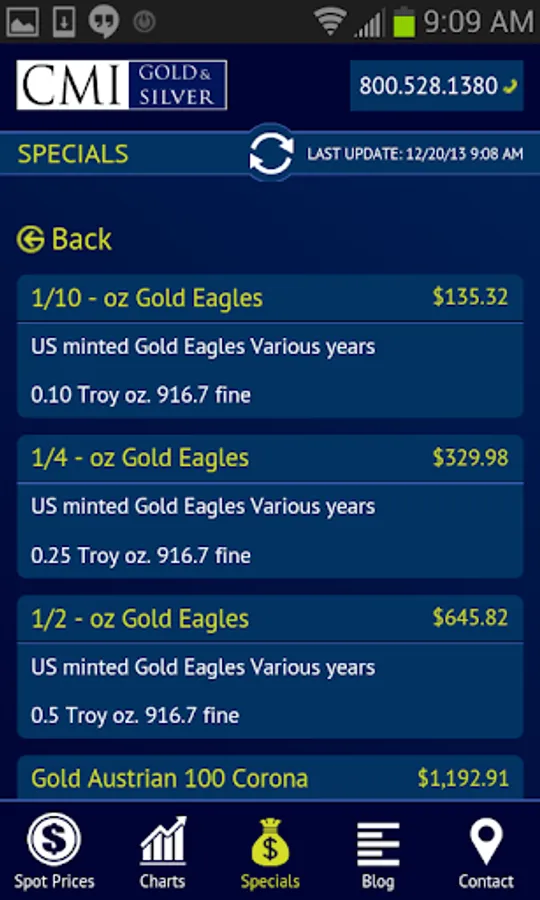 This application provides viewers four features that should be of interest to all precious metals investors. One, they can view live, up to the minute, spot prices for gold, silver, platinum and palladium. Two, interactive charts are available to gain historical perspectives on price action. Three, links to CMI's latest blog posts are provided in an easy to read format. Four, CMI’s Specials are available for investors looking to buy at the smallest premiums over spot.