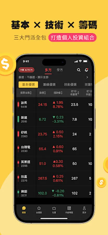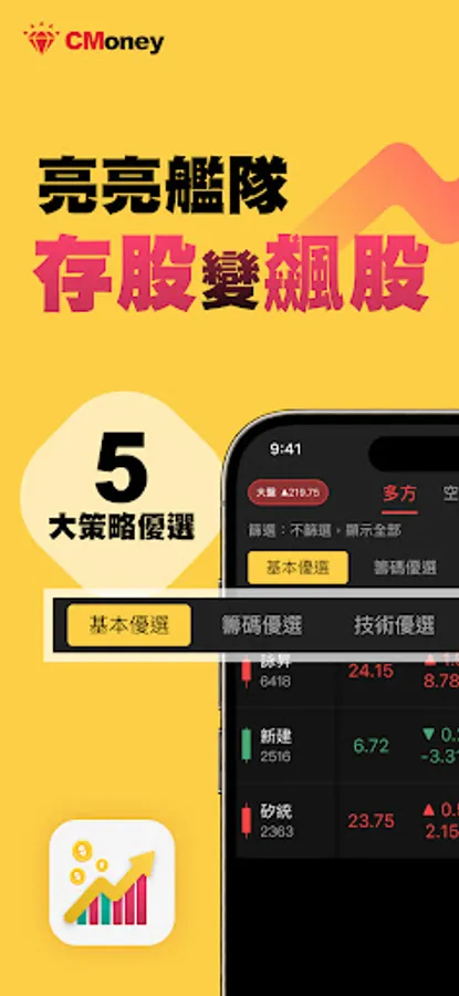 The system has five built-in optimization strategies, integrating the three major aspects of [Fundamental Selection], [Technical Selection] and [Chips Selection] as the basis, and then extends [Technical and Financing Double Selection] and [Long-term Yield Selection] as advanced stock selection. Let you create your own investment portfolio.