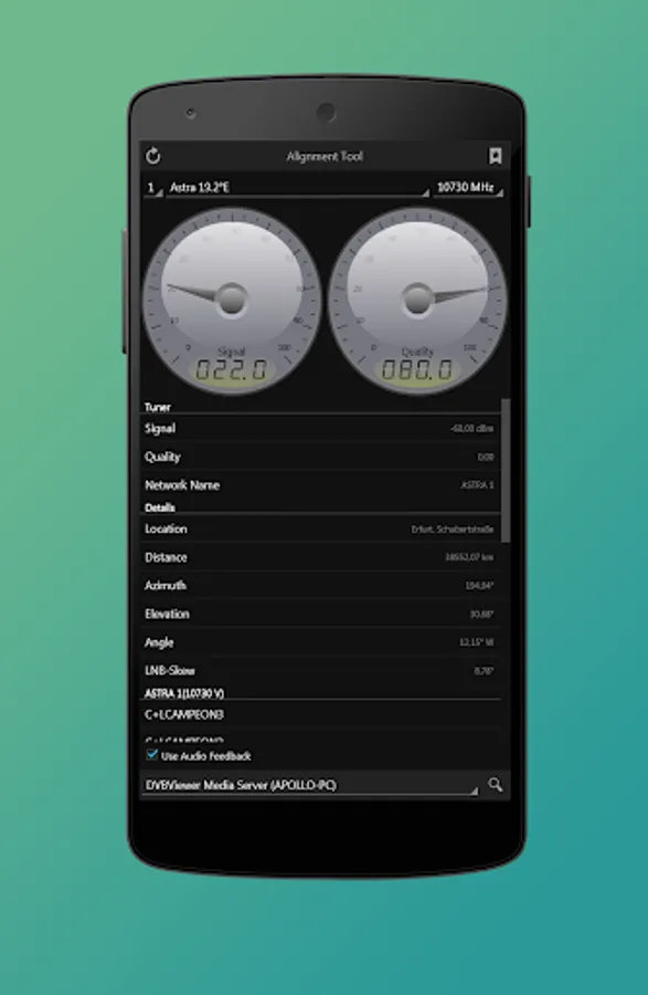This application is designed to help users point their satellite dish/antenna using a SAT>IP server or a compliant IP-LNB.