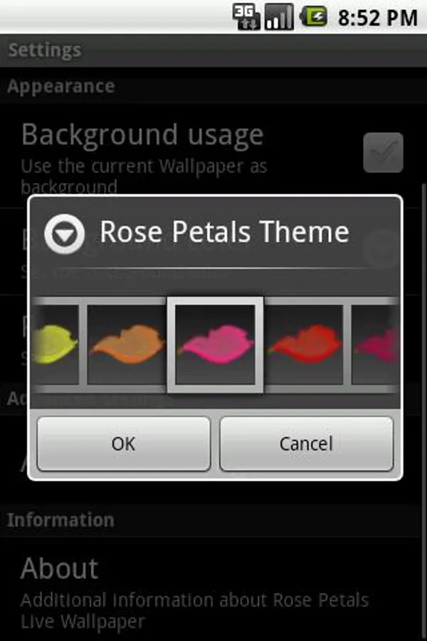 The free Rose Petals Live Wallpaper displays a rose petal animation falling down. You can choose to use your current background wallpaper or set a specific color shading, choose one of the seven different rose petal themes. You can configure the brightness, density, scale and speed creating your ultimate animation.